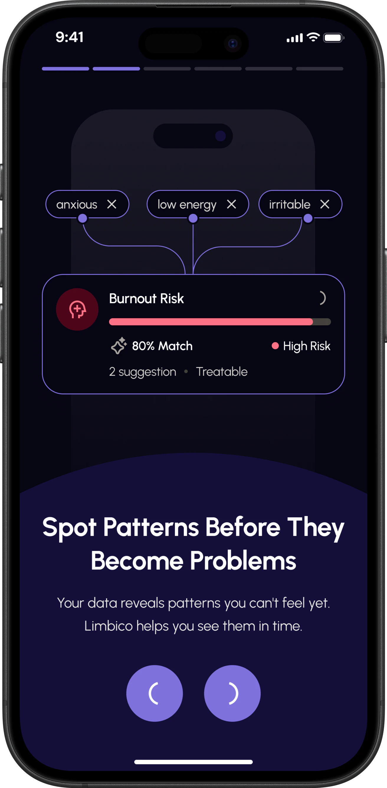 Screen time, movement, daily routines — your phone already knows them. Limbico analyzes these patterns automatically, no logging required