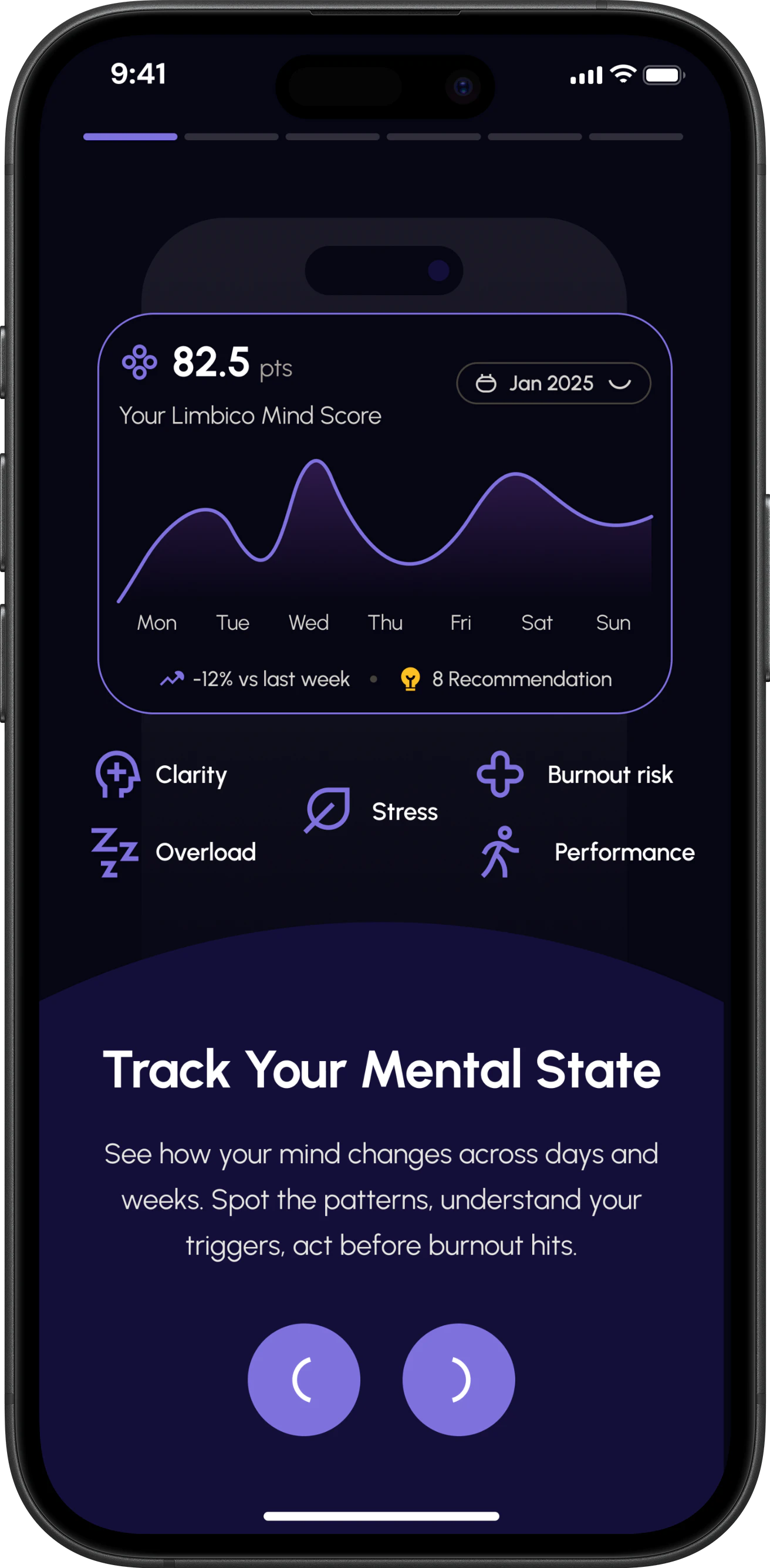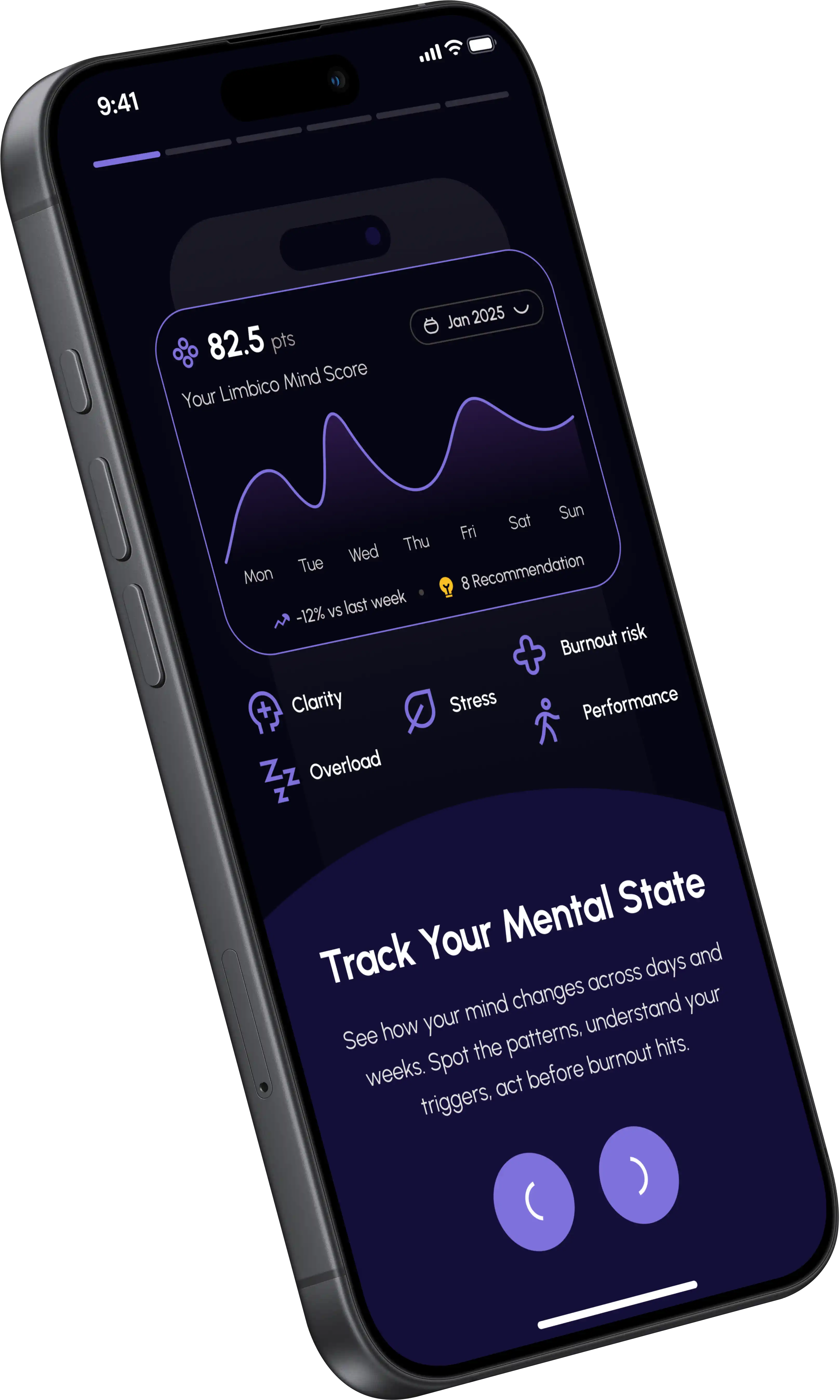 Connect any wearable you already own. Limbico analyzes the signals it captures - HRV, sleep, stress, and more - and turn them into insights about your mental state