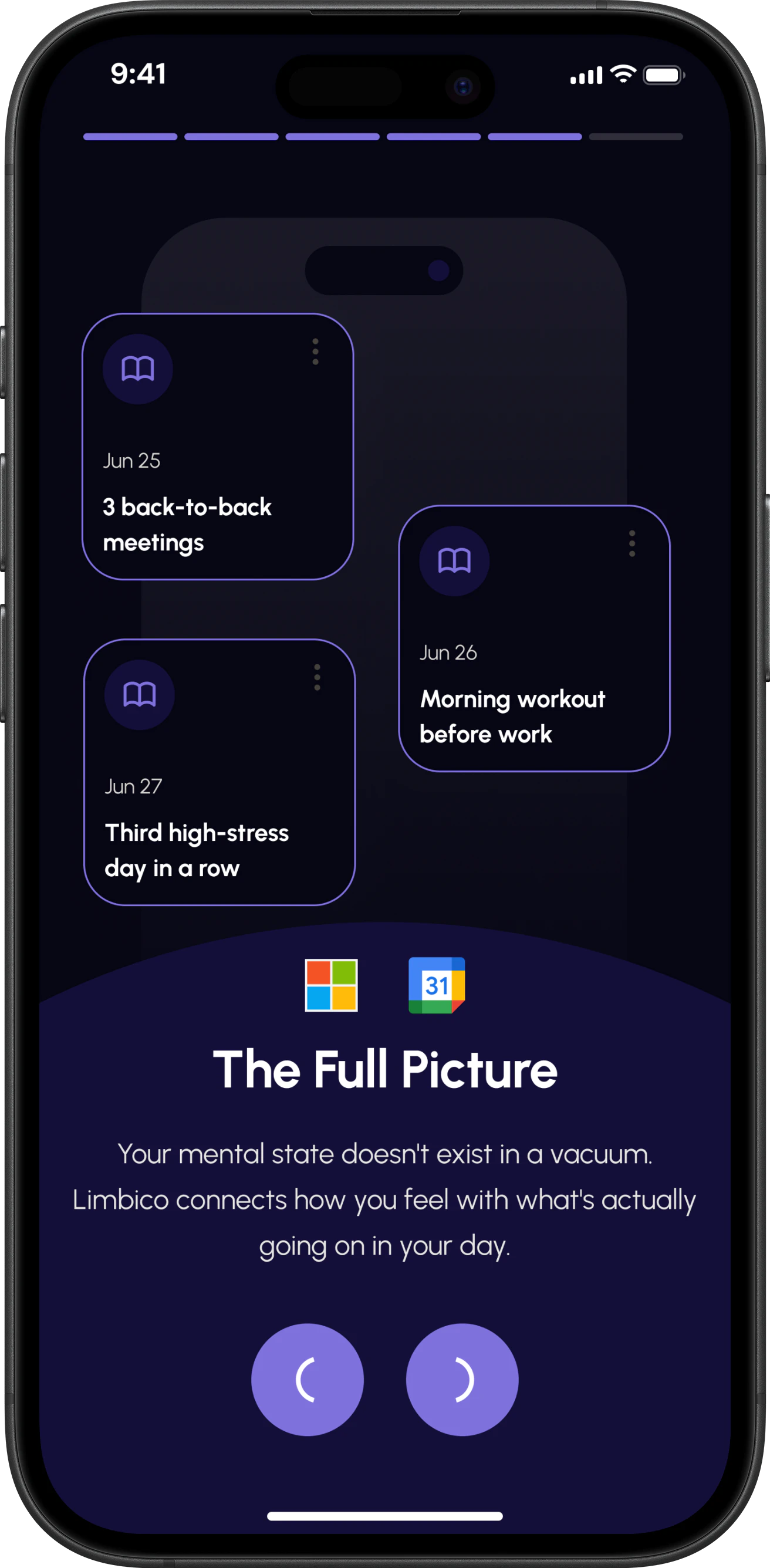 Meetings, deadlines, travel — your calendar tells the story of your day. Limbico reveals what's actually driving how you feel
